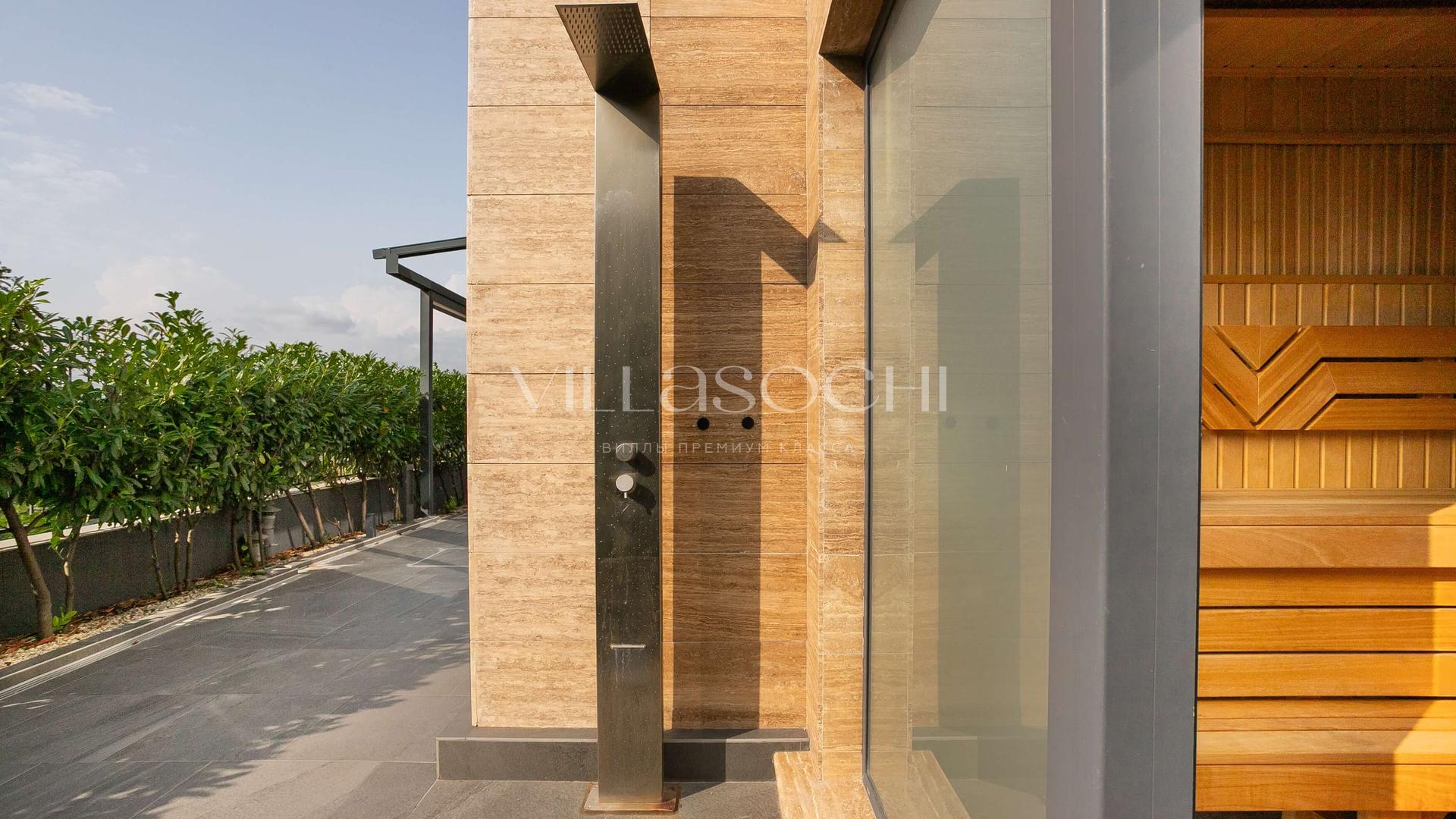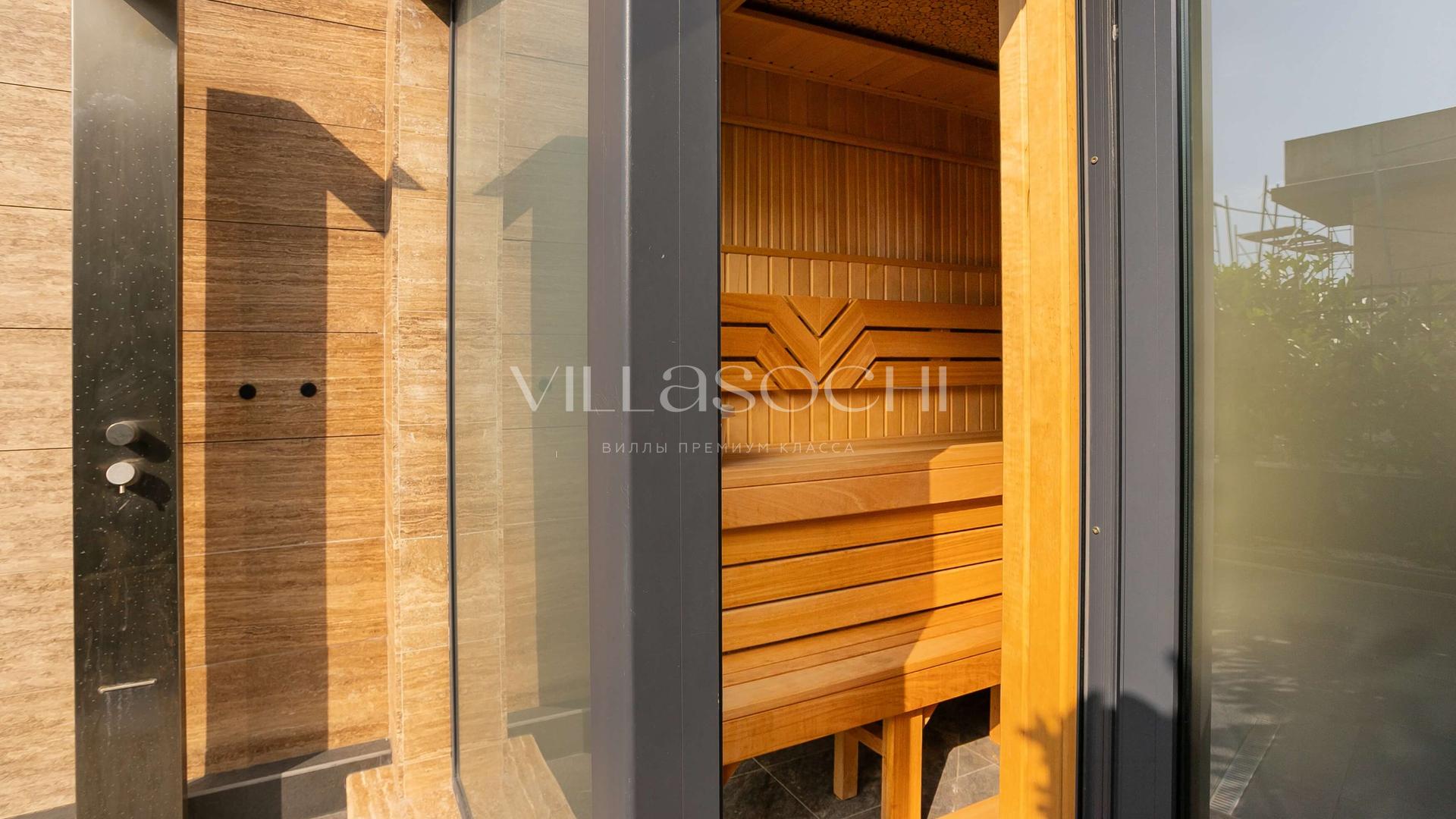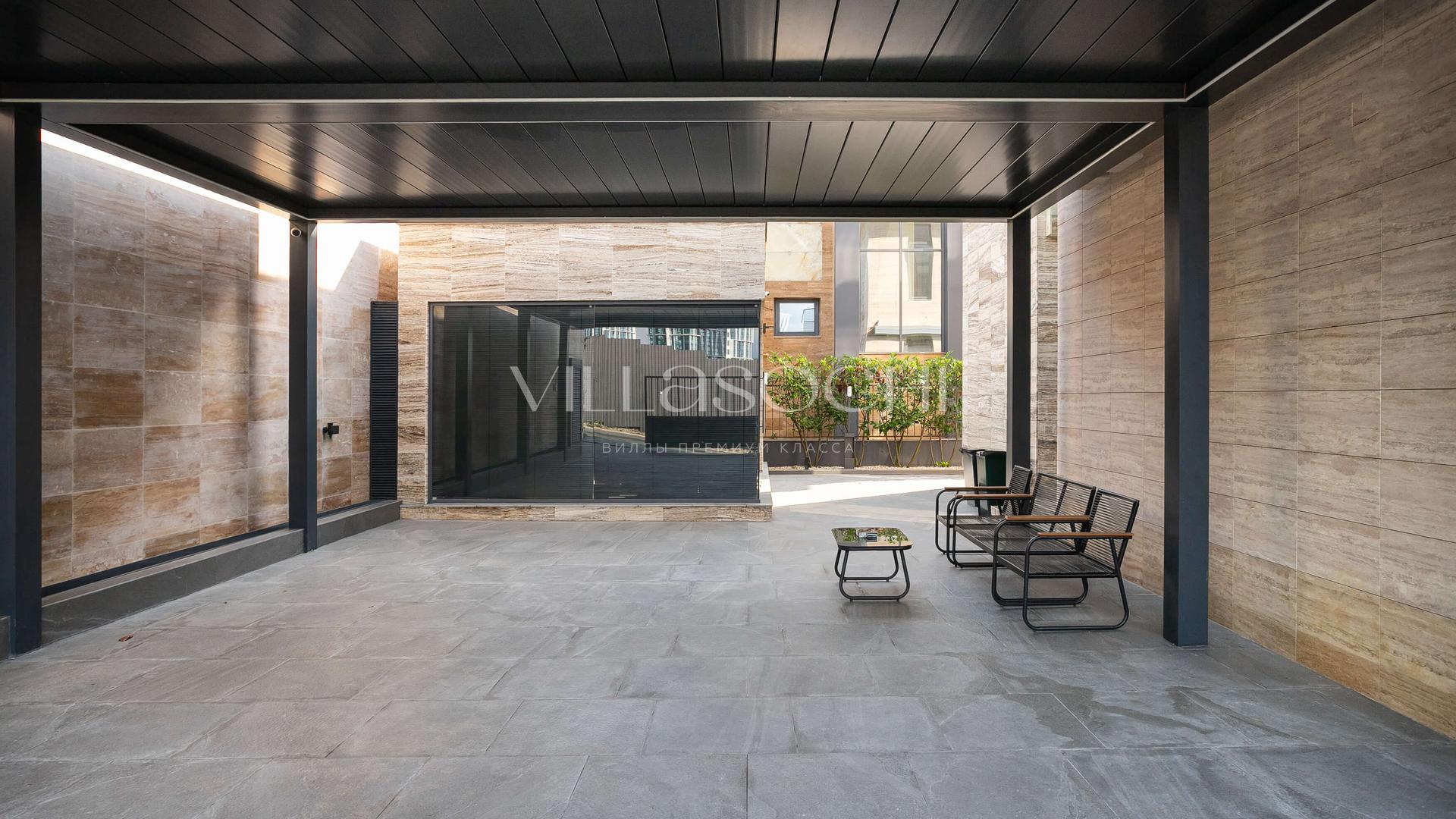 На территории *подогреваемый бассейн, сауна, спортзал*, парковка с биоклиматической перголой на два автомобиля.