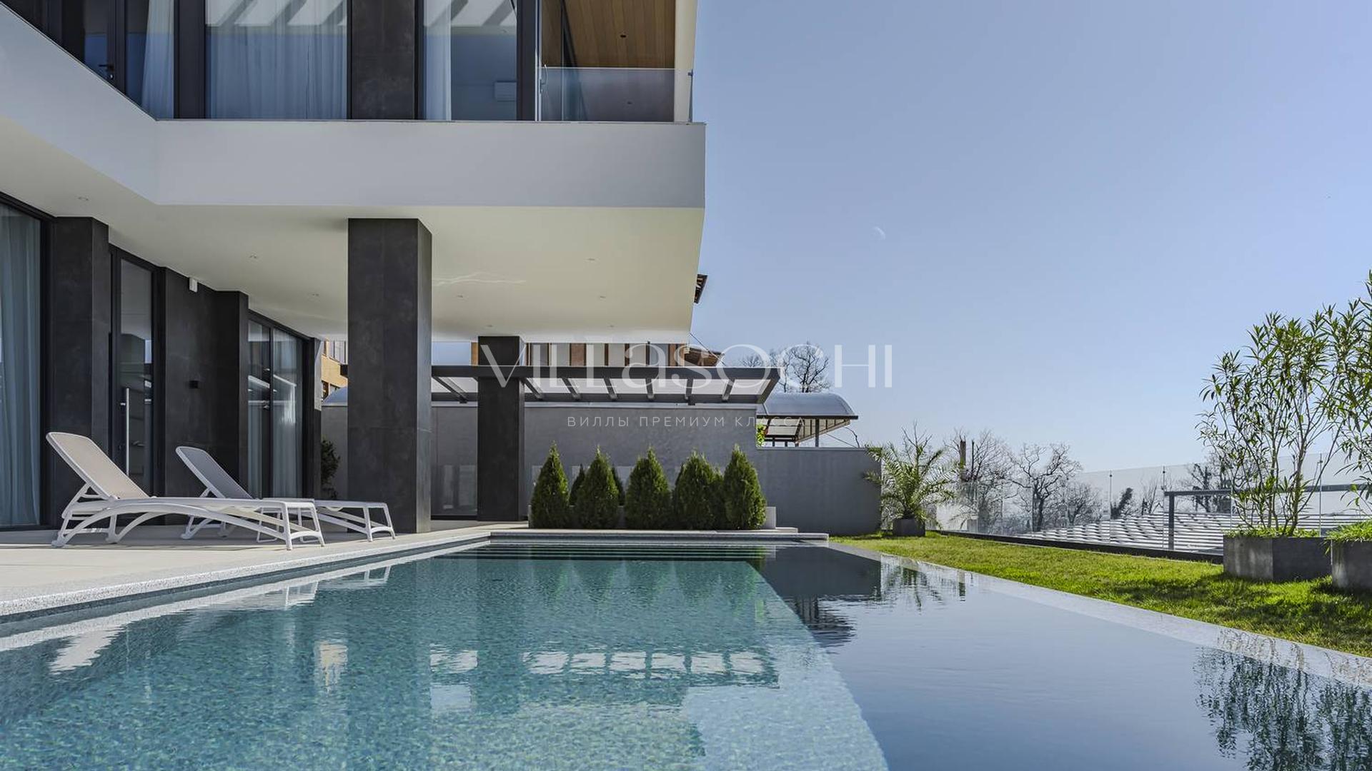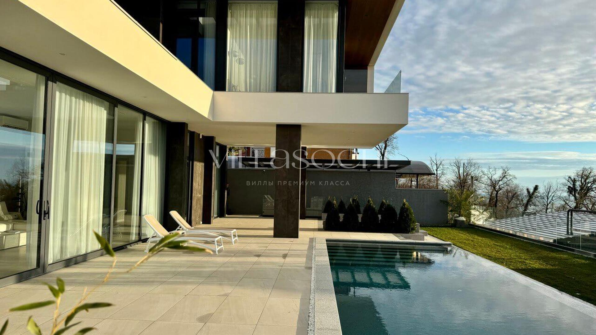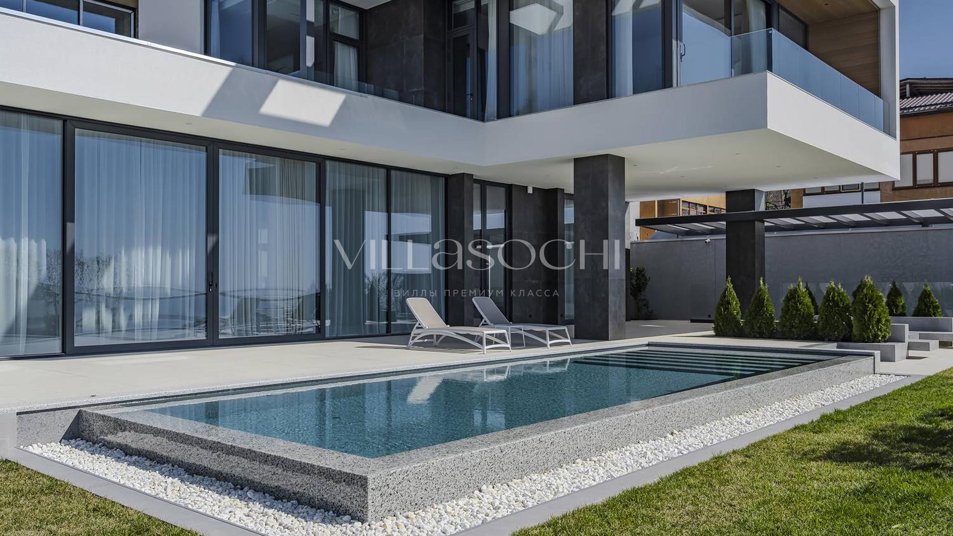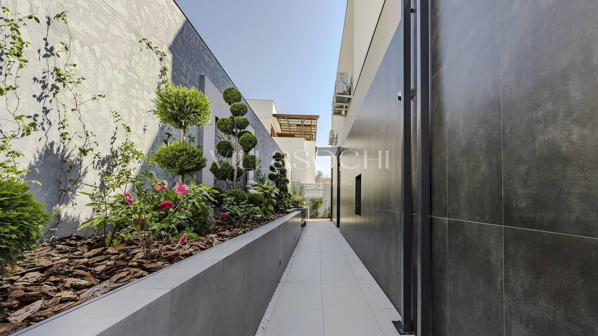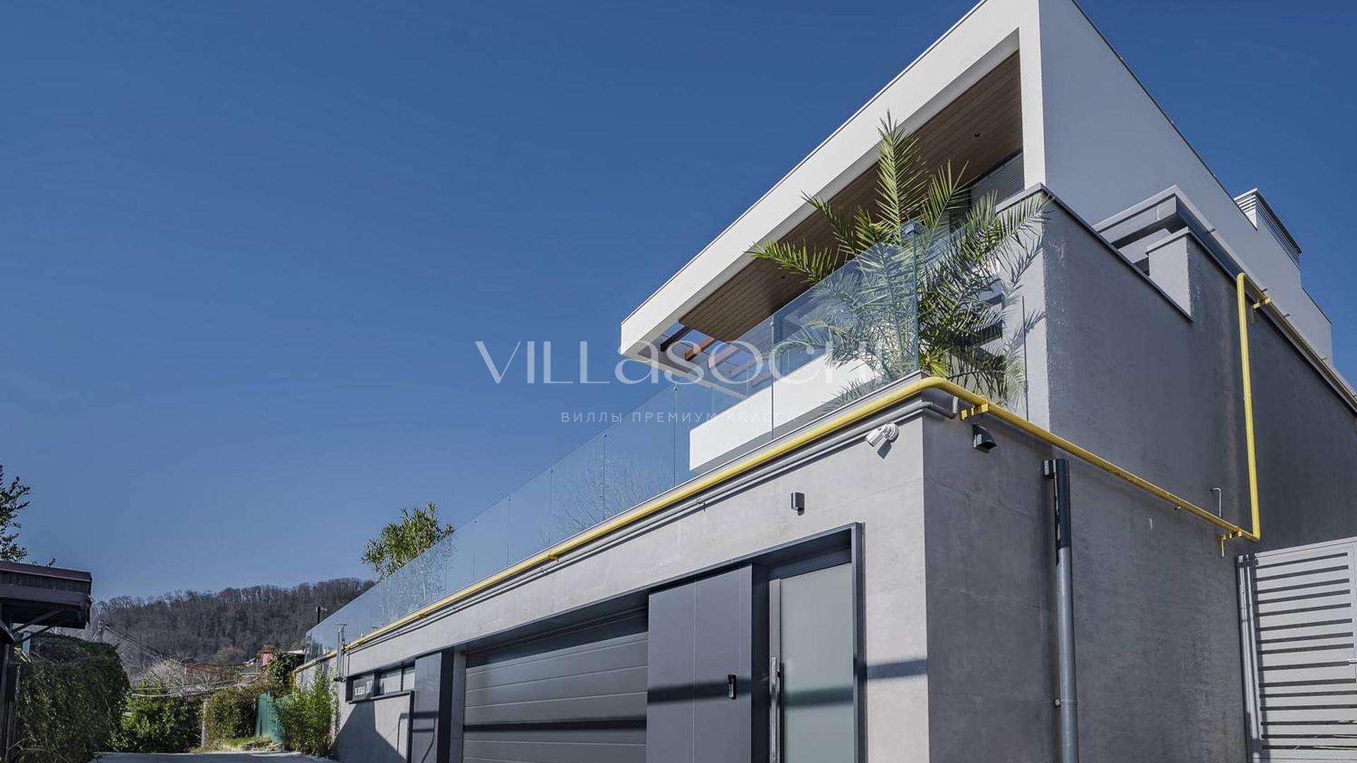 Представлена к продаже новая вилла в Хосте. Архитектурный сложный фасад использует пространство территории максимально эффективно, ночная подсветка, ландшафтное озеленение, на эксплуатируемой кровле гаража совмещенного с котельной. Наличие сауны и бассейна 11 на 3,5 метра.