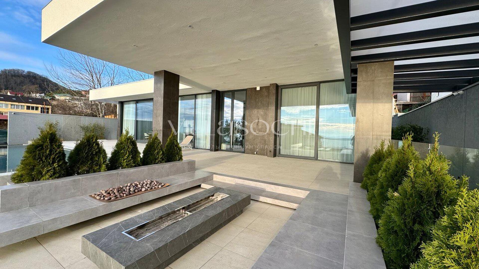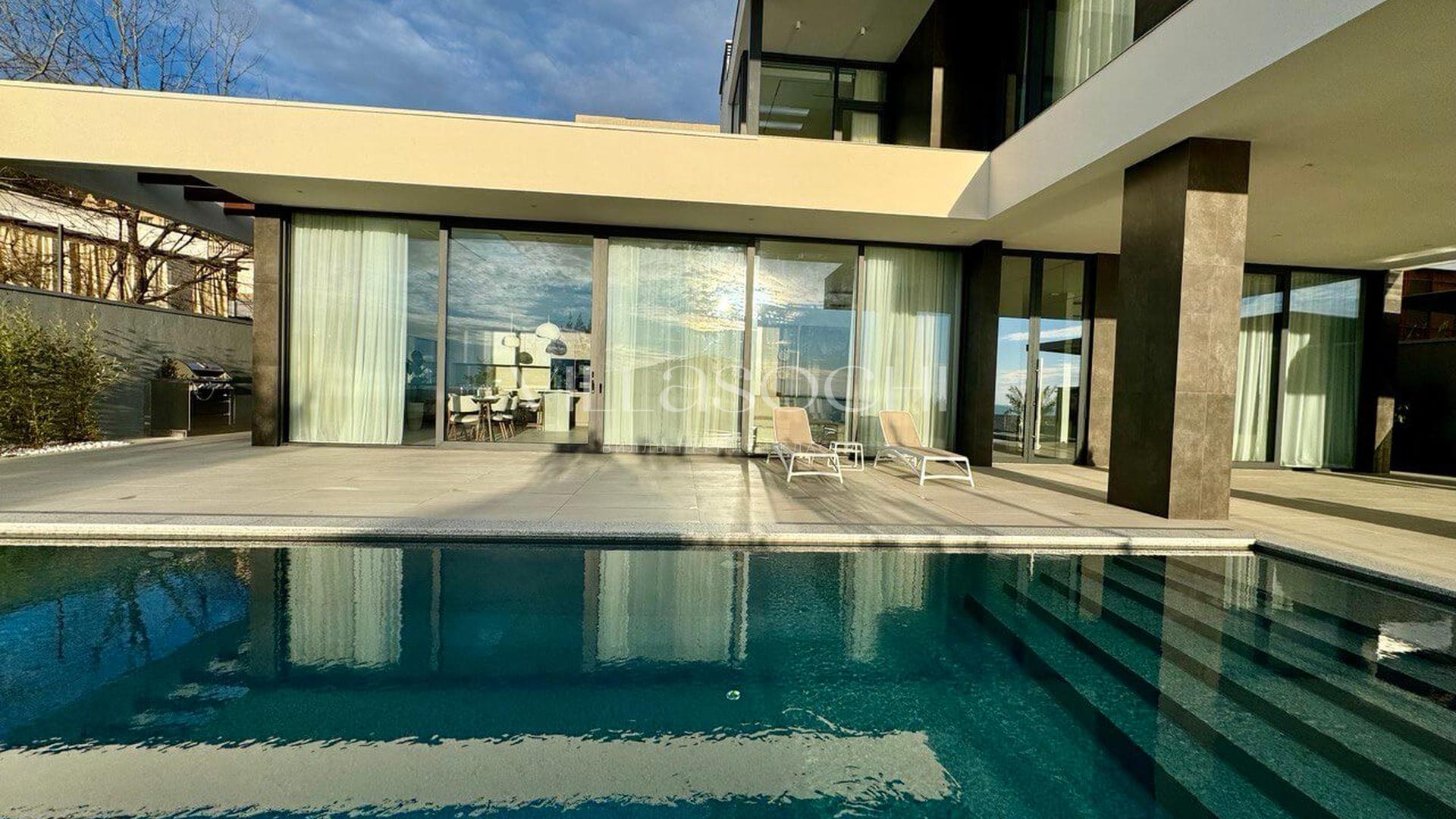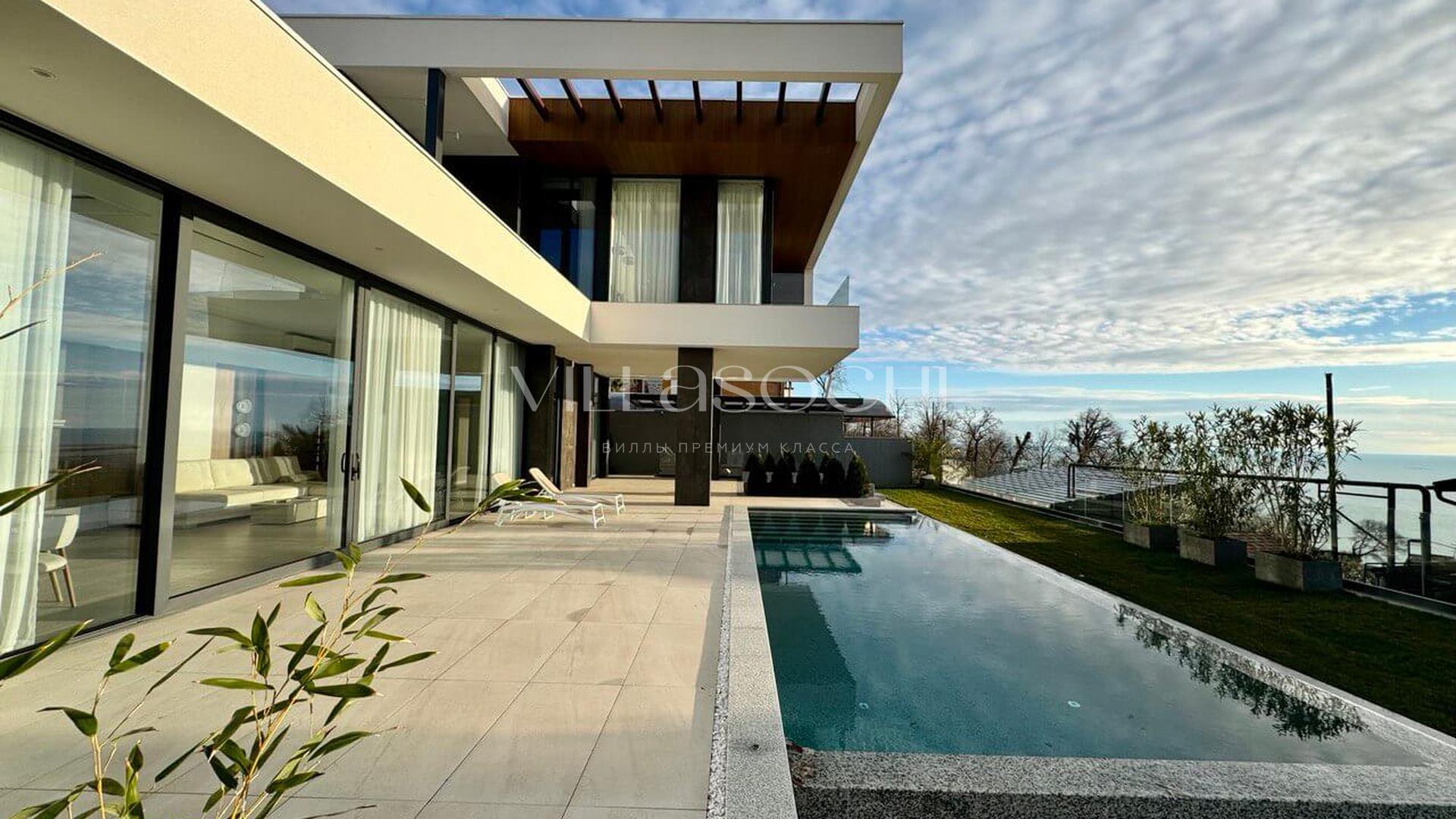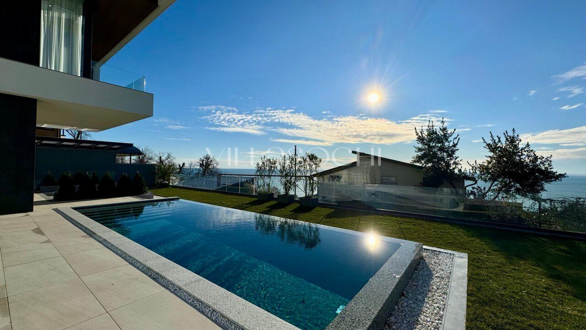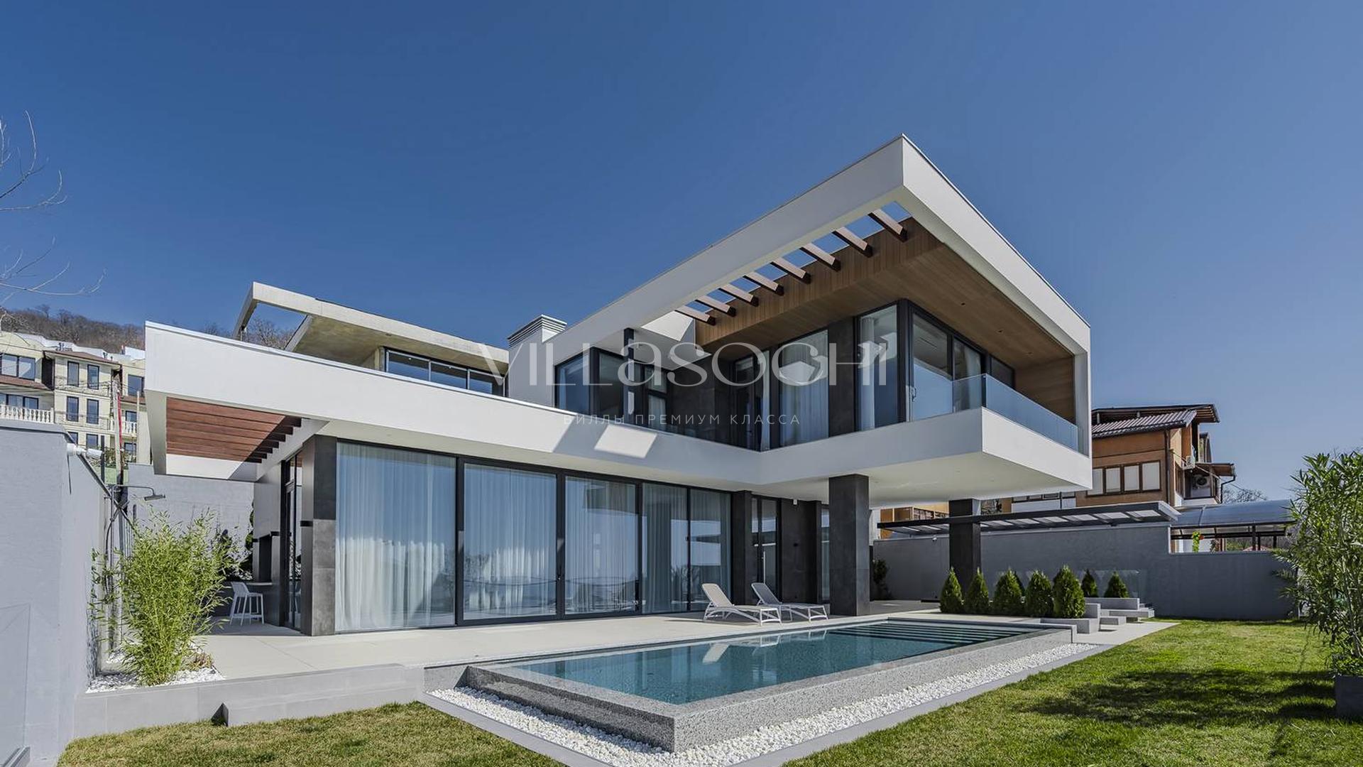 Представлена к продаже новая вилла в Хосте. Архитектурный сложный фасад использует пространство территории максимально эффективно, ночная подсветка, ландшафтное озеленение, на эксплуатируемой кровле гаража совмещенного с котельной. Наличие сауны и бассейна 11 на 3,5 метра.