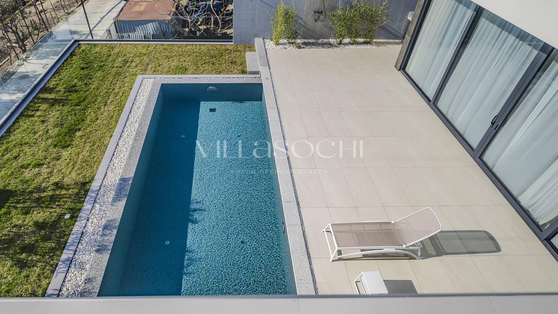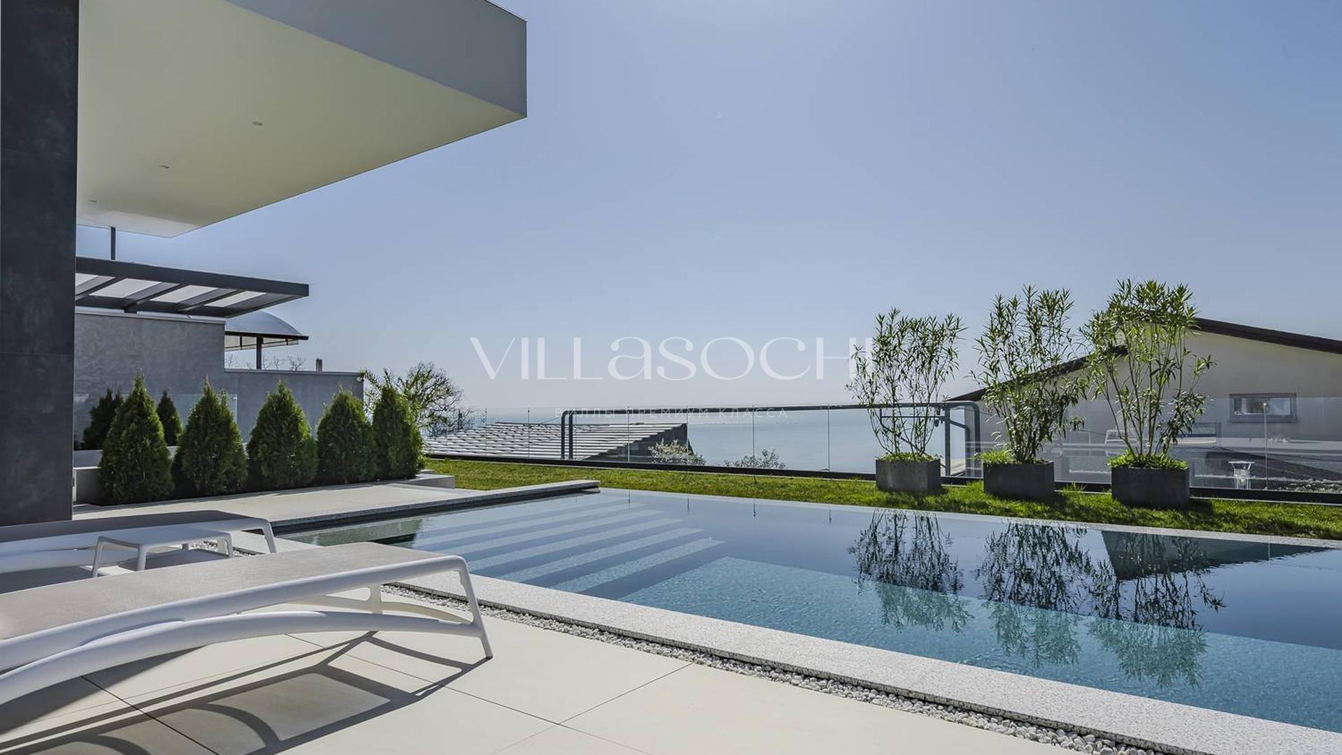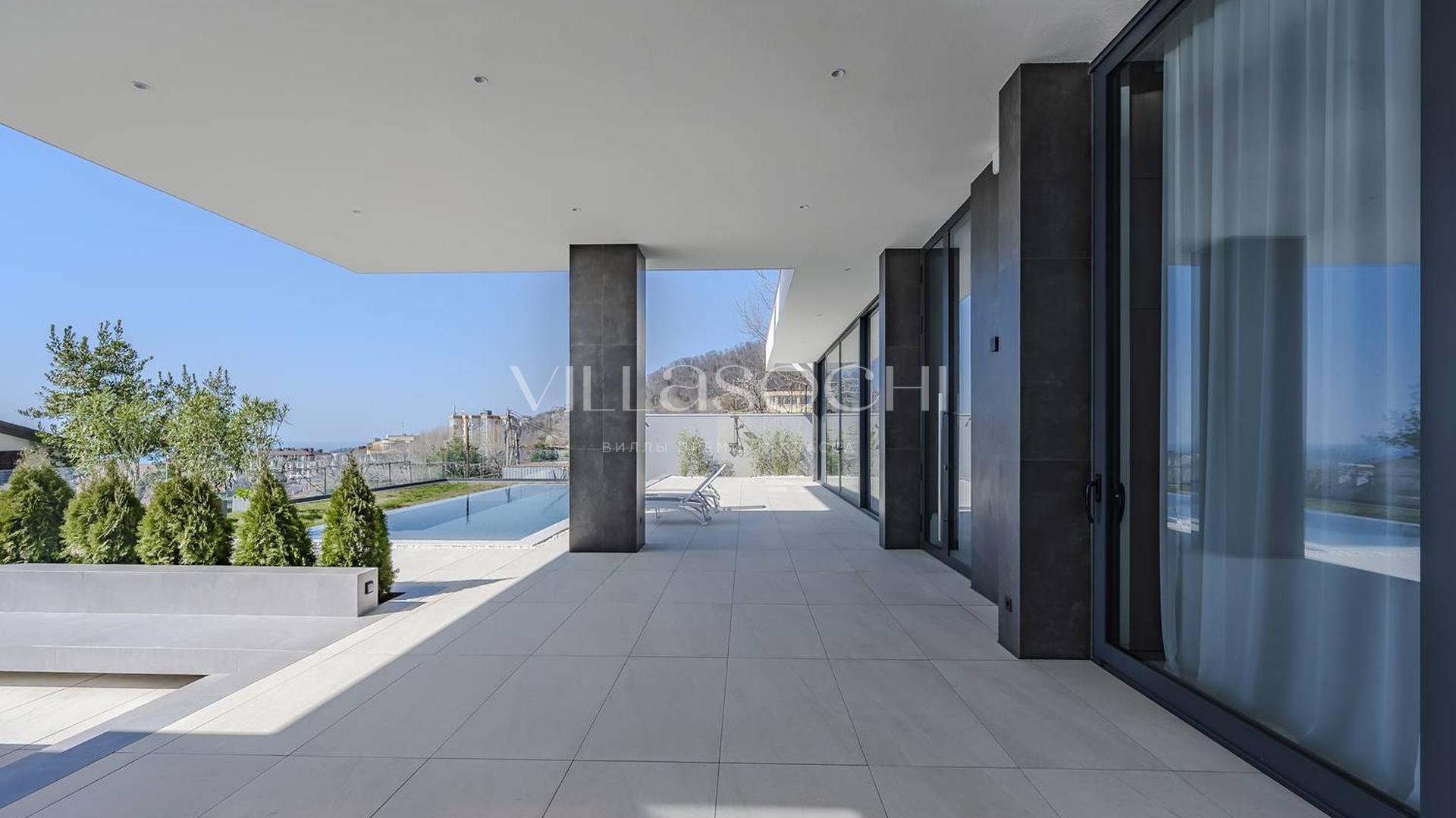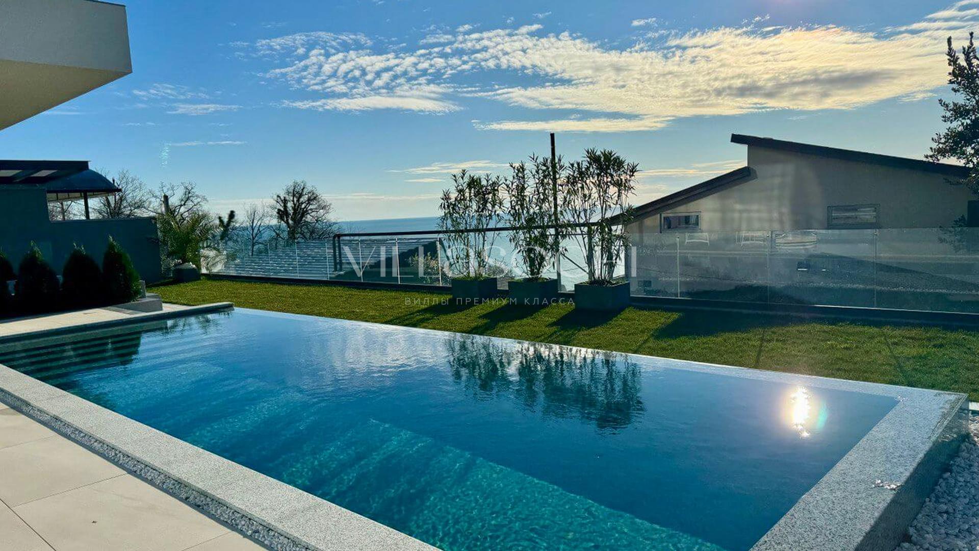 Представлена к продаже новая вилла в Хосте. Архитектурный сложный фасад использует пространство территории максимально эффективно, ночная подсветка, ландшафтное озеленение, на эксплуатируемой кровле гаража совмещенного с котельной. Наличие сауны и бассейна 11 на 3,5 метра.